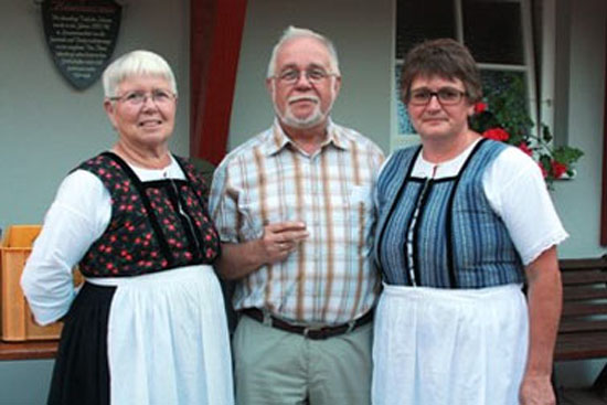 Reinhard Kahl mit zwei Hainscher Damen in Alltags- und Festtagstracht